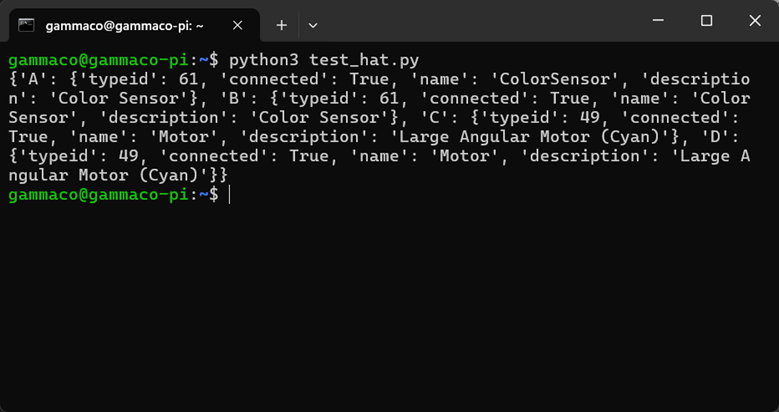 จากตัวอย่างนี้ เราจะเห็นได้ว่าระบบจะแสดงข้อมูลอุปกรณ์ LEGO ที่เชื่อมต่ออยู่กับ Build HAT ขึ้นมาว่าแต่ละพอร์ตมีอุปกรณ์ประเภทใดบ้าง เช่น มอเตอร์หรือเซนเซอร์แต่ละชนิด ช่วยให้เราตรวจสอบการเชื่อมต่อได้อย่างง่ายดาย