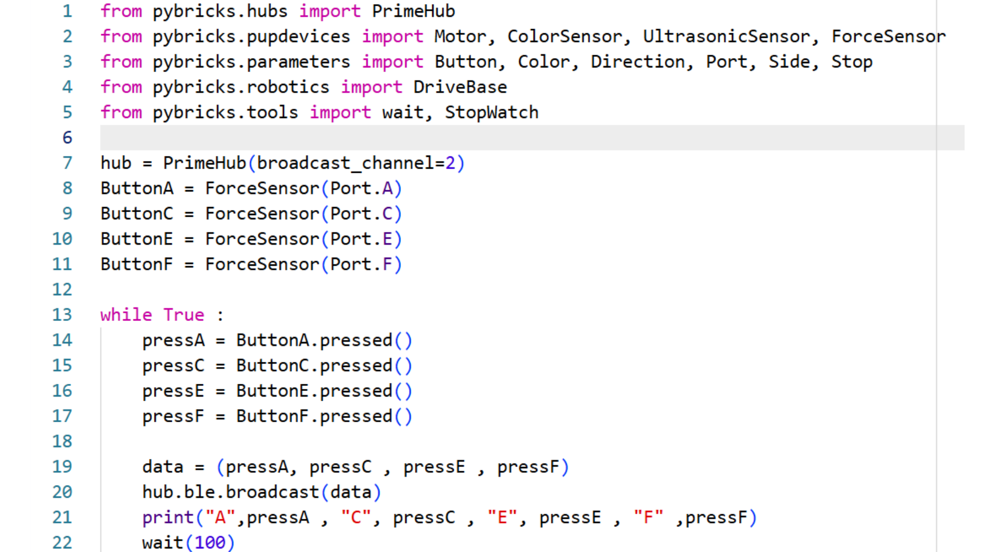 ลำดับที่สอง บรรทัดที่ 7 ถึง 11 จะเป็นการตั้งชื่อ ForceSensor ของเรา ซึ่งเราได้ใช้ทั้งหมด 4 ชิ้น แต่ จะพิเศษที่ บรรทัดที่ 7 โดย hub = PrimeHub(broadcast_channels=[2]) ซึ่ง ตัวเลขตัวท้ายสุดท้ายคือ ช่องสัญญา ต้องตั้งให้ตรงกันทั้งตัวรับและตัวส่ง และในที่นี้ ผมได้ใช้เป็นเลข “2”
