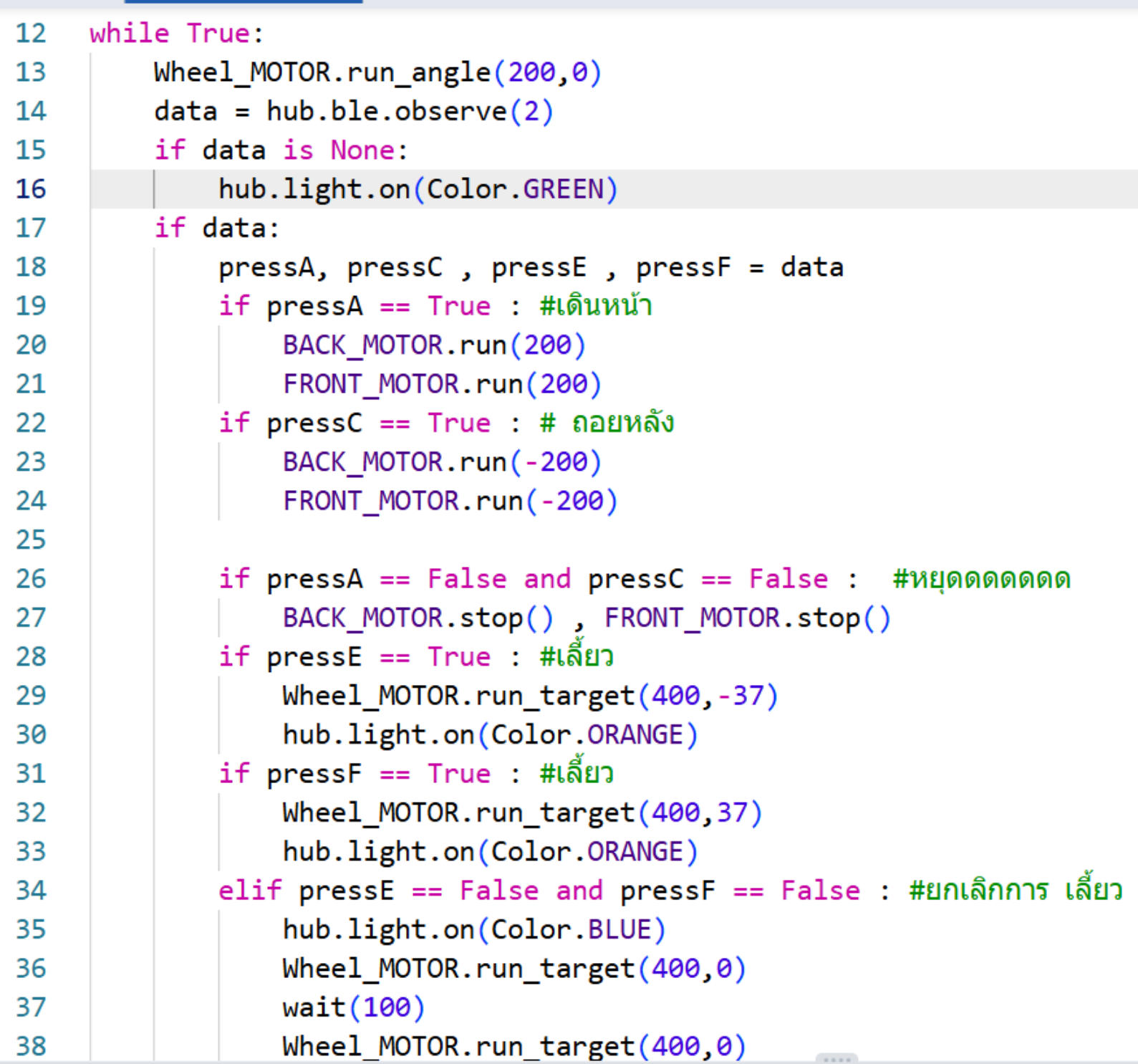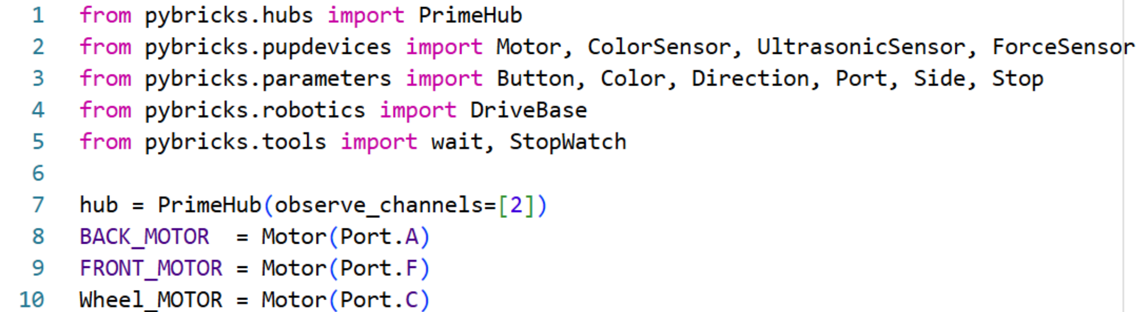 ลำดับที่สอง บรรทัดที่ 7 ถึง 10 จะเป็นการตั้งชื่อ มอเตอร์ของเรา แต่ จะพิเศษที่ บรรทัดที่ 7 โดย hub = PrimeHub(observe_channels=[2]) ซึ่ง ตัวเลขตัวท้ายสุดท้ายคือ ช่องสัญญา ต้องตั้งให้ตรงกันทั้งตัวรับและตัวส่ง และในที่นี้ ผมได้ใช้เป็นเลข “2”