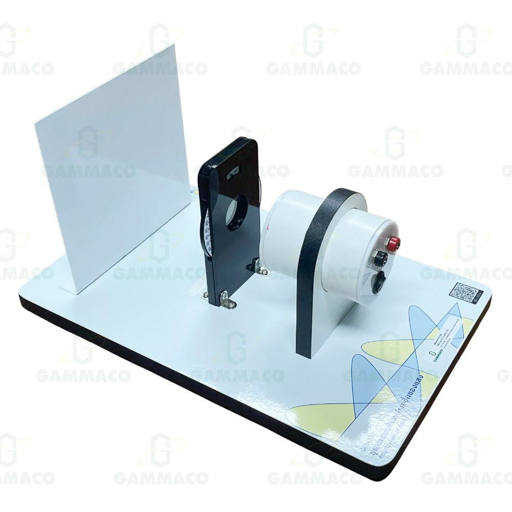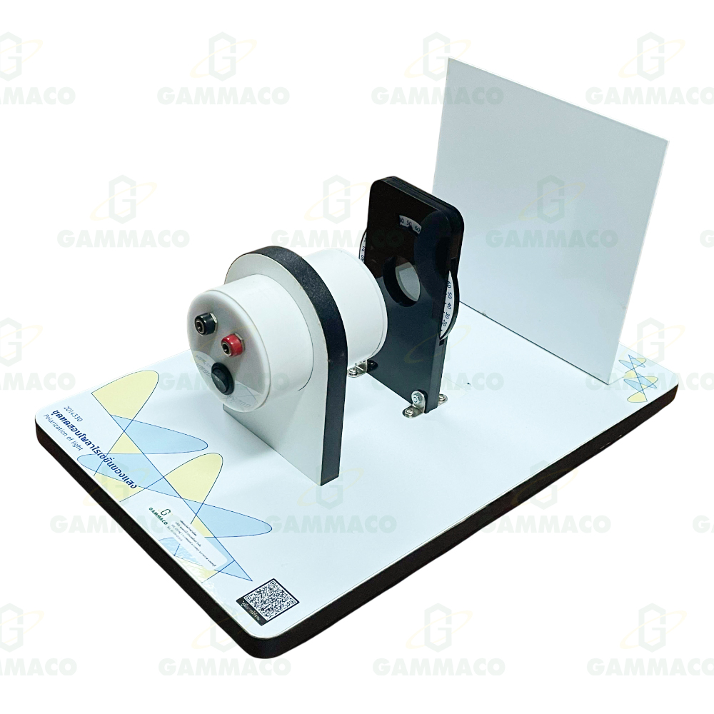This apparatus has a light box which uses 12V A.C./D.C., which is located near the Polaroid which is held by a circular block of wood, there is a scale that shows the angle in the circular block of wood. At the back, there is a screen which is held with the base.